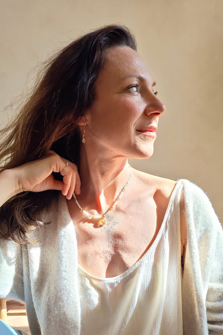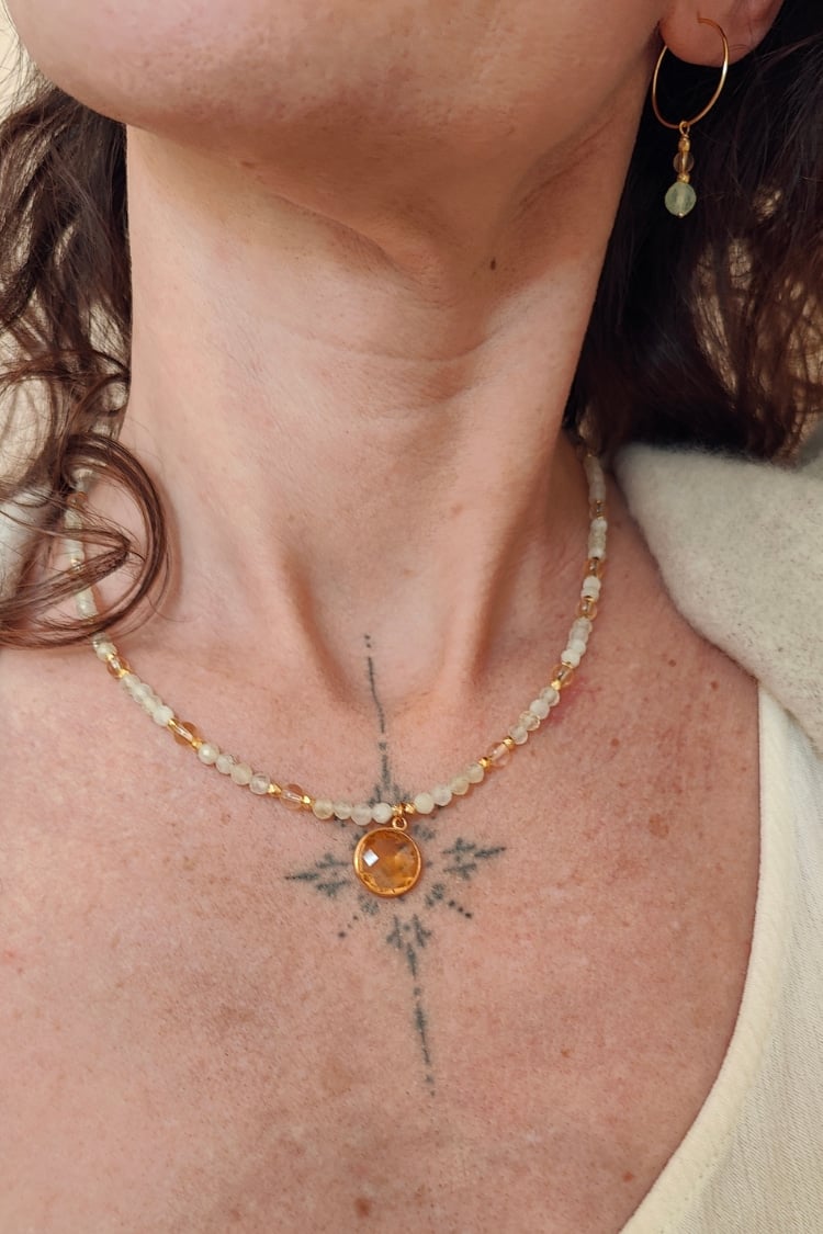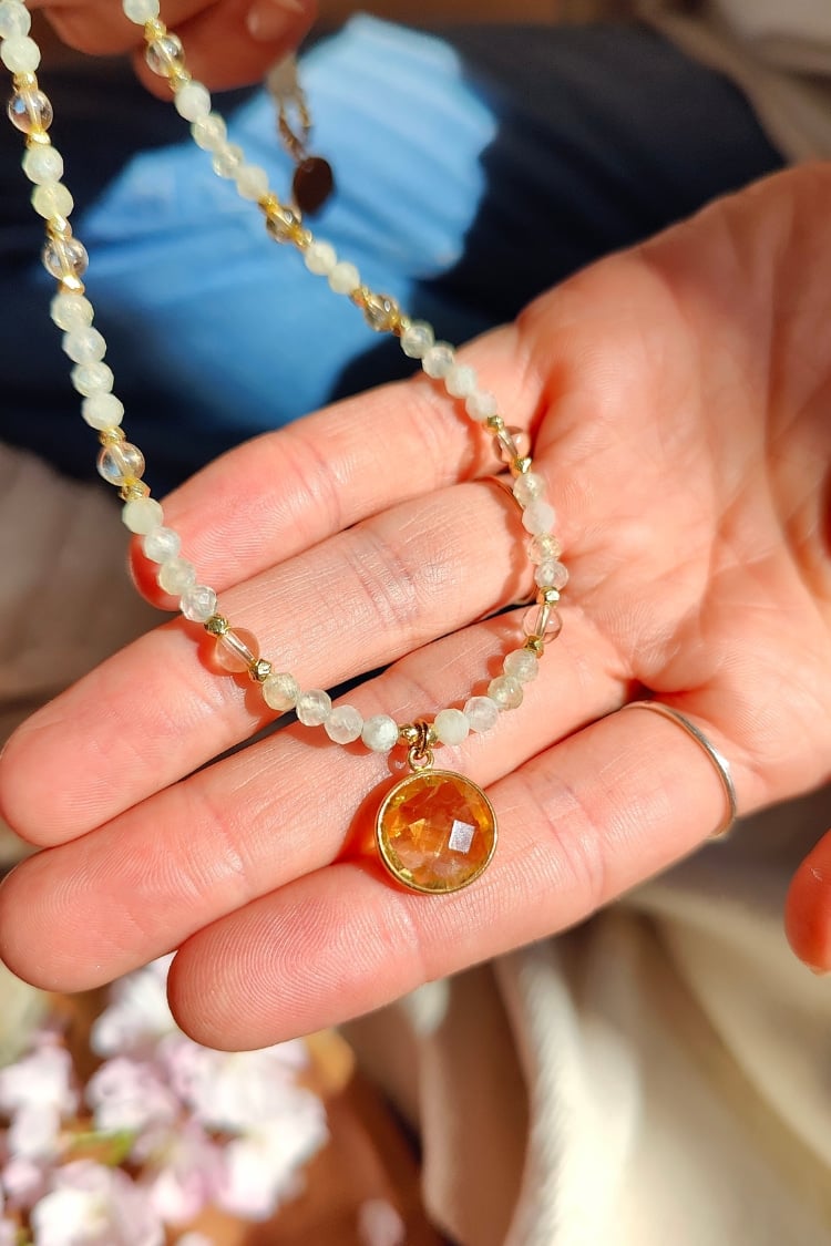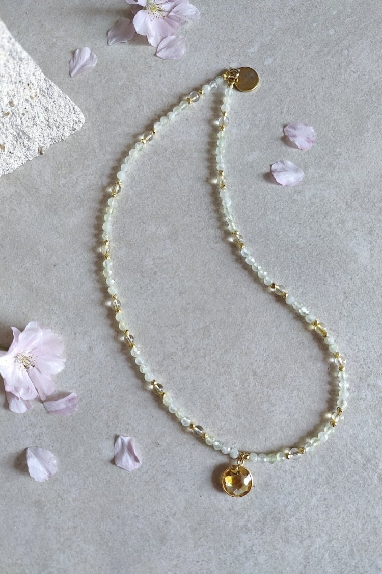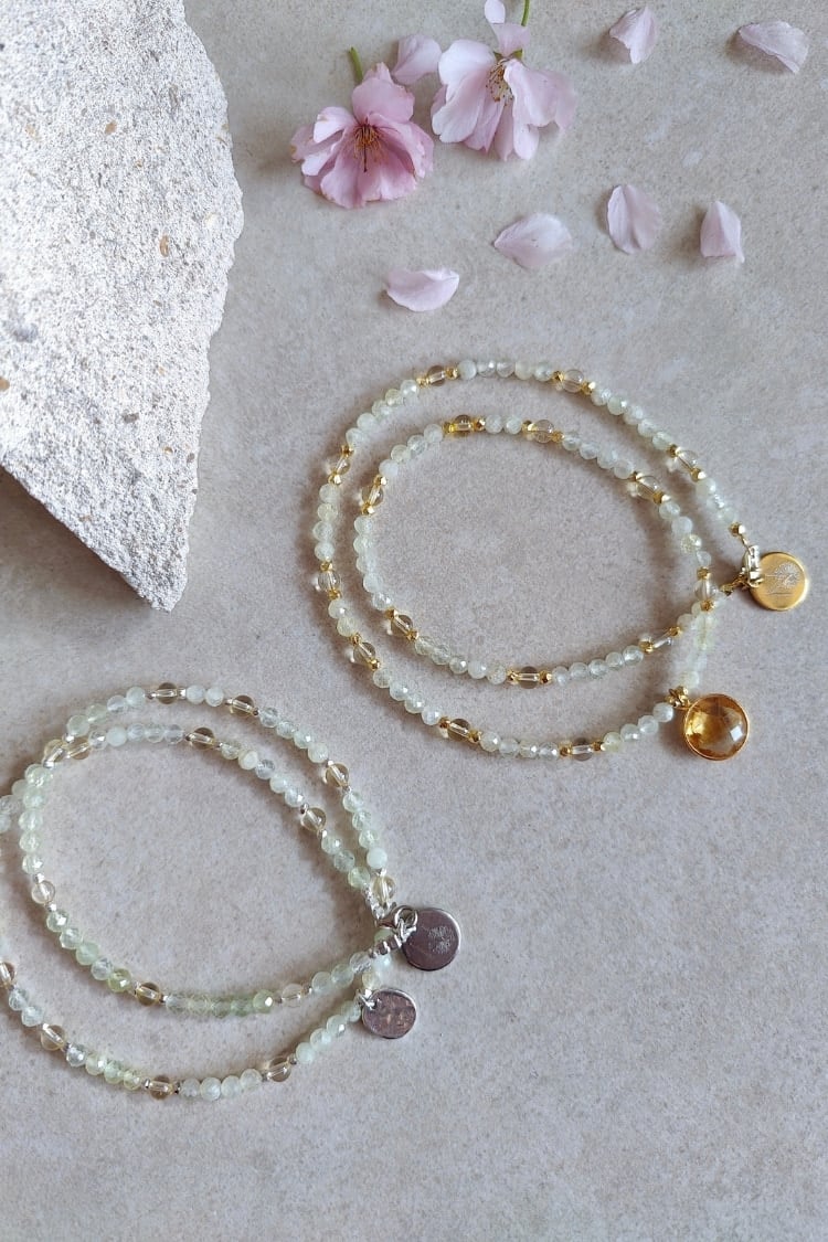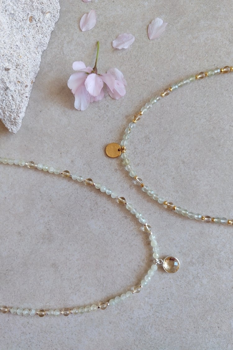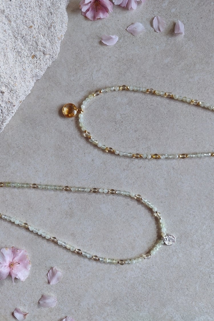 Die BLOOM & GLOW Kette begleitet dich auf deinem Weg vom stillen Inneren bis zum vollen Strahlen deiner Blüte. Prehnit und Citrin unterstützen dich dabei, Schicht für Schicht loszulassen, dein Licht zu entdecken und es kraftvoll zu leben.