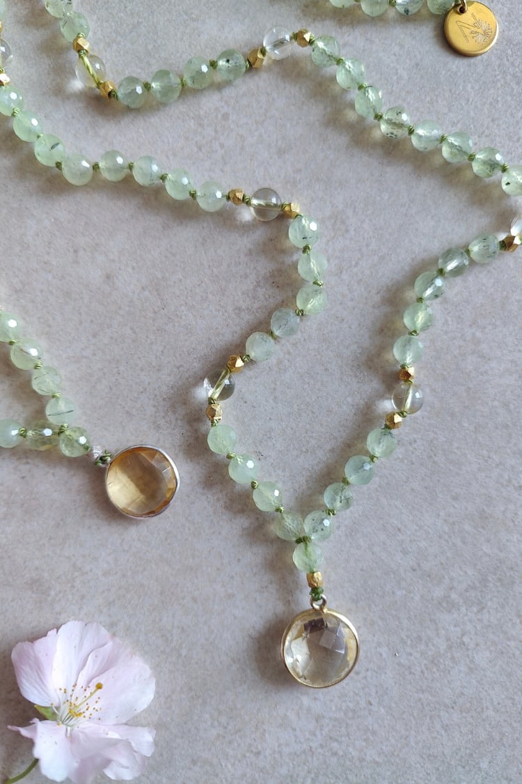 Die BLOOM & GLOW Mala begleitet dich auf deinem Weg vom stillen Inneren bis zum vollen Strahlen deiner Blüte. Prehnit und Citrin unterstützen dich dabei, Schicht für Schicht loszulassen, dein Licht zu entdecken und es kraftvoll zu leben. Das Herzstück bildet ein wunderschöner Citrin-Abschluss.