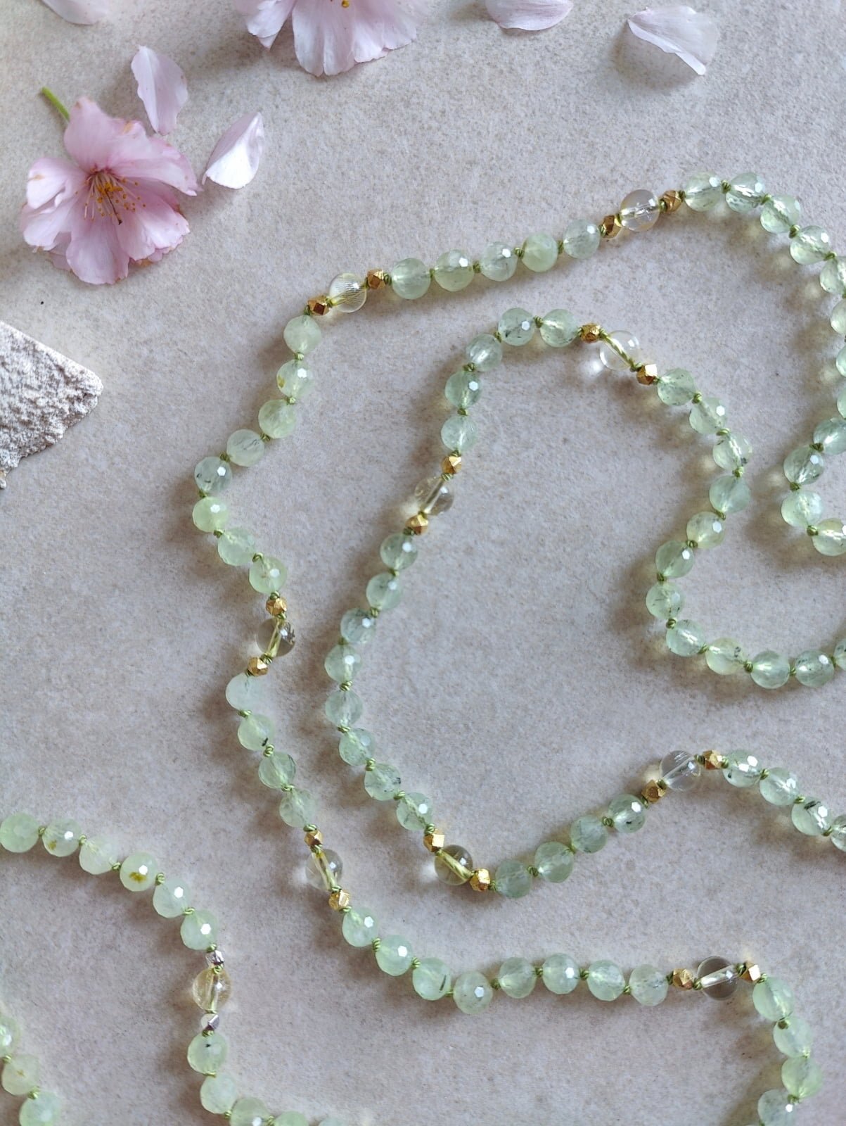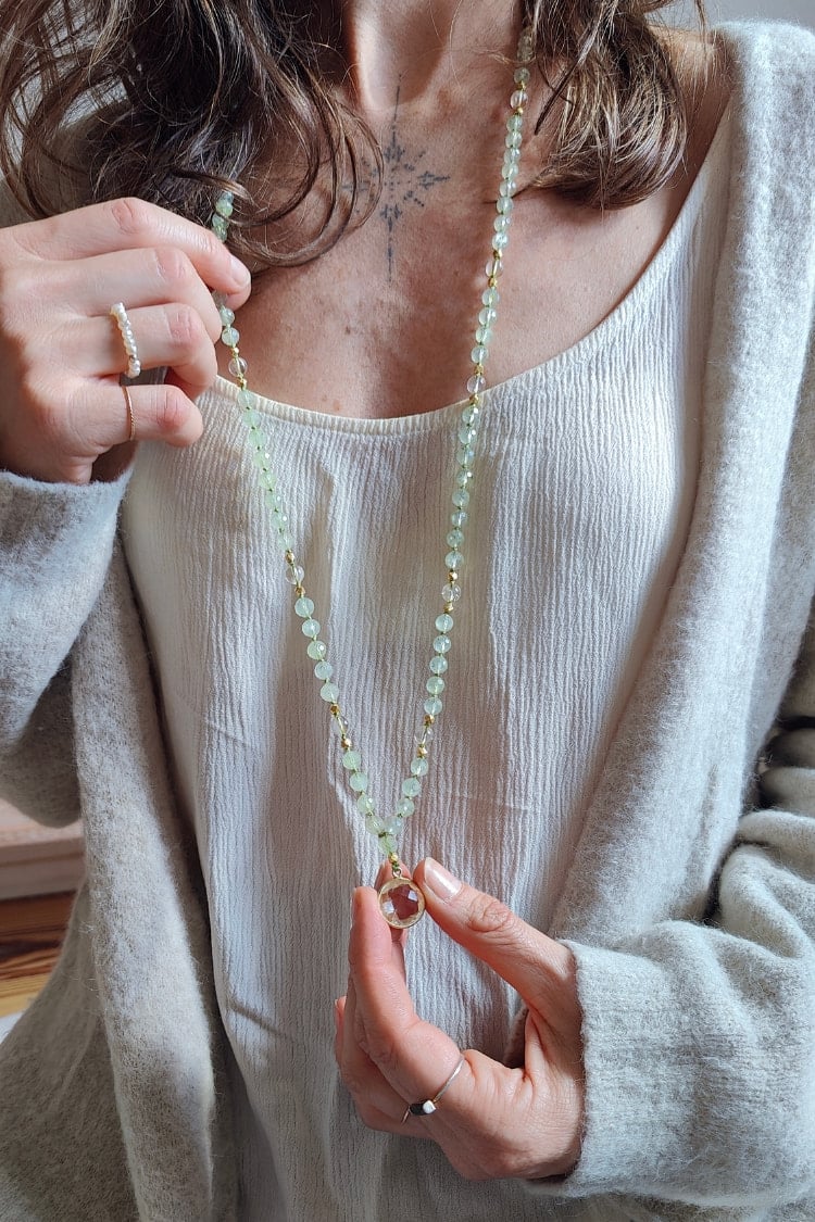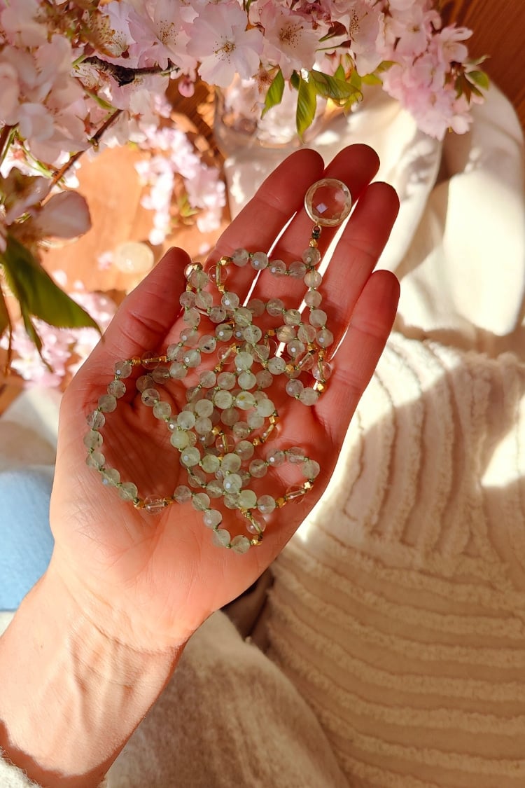 Die BLOOM & GLOW Mala lädt dich ein, innezuhalten und nach innen zu lauschen, dorthin, wo dein Wachstum beginnt. Der Prehnit nimmt dich sanft an die Hand und begleitet dich in die Tiefe, zu den Anteilen in dir, die gesehen und gehalten werden wollen. Er unterstützt dich mit seiner liebevollen Kraft dabei, zu erkennen und zu integrieren, sodass sich Schicht für Schicht ganz behutsam lösen darf – wie eine Knospe, die sich langsam entfaltet, Blatt für Blatt, bis sie sich dem Licht öffnet.