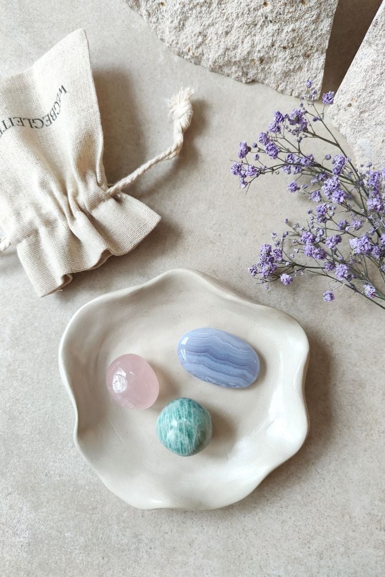 Diese Edelsteinset besteht aus drei geschliffenen funkelnden Edelsteinen: Chalcedon, Amazonit und Rosenquarz. Es unterstützt dich dabei, wahrhaftige und erfüllende Beziehungen mit deinen Liebsten zu führen und mit einem offenem Herzen auf andere Menschen zuzugehen.