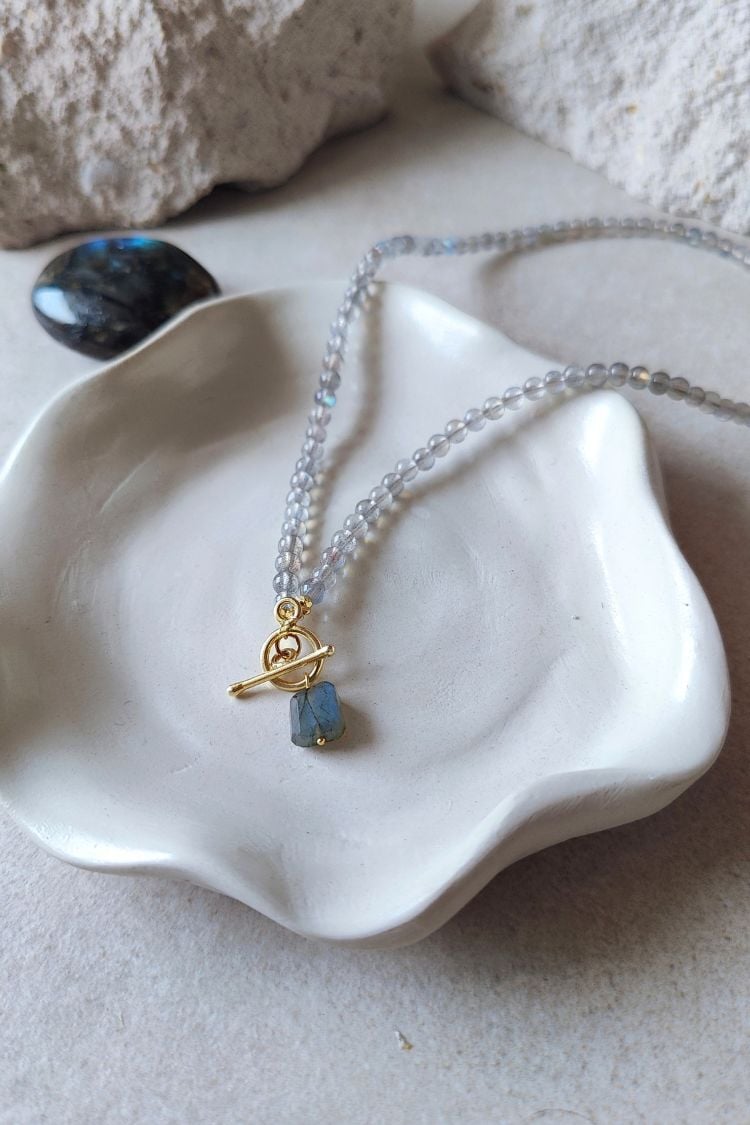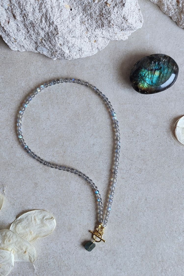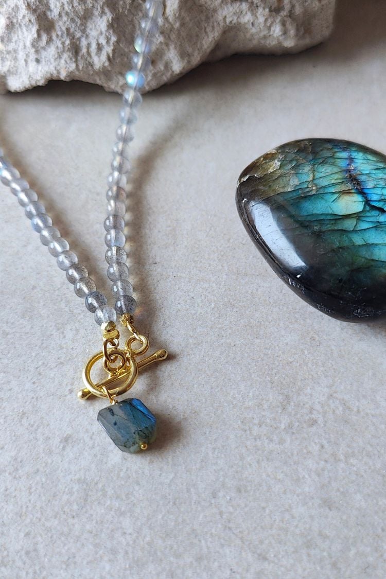 Diese kurze Kette ist gearbeitet aus wunderschönen leuchtenden Labradoritperlen. Das Herzstück der Kette bildet ein funkelnder Labradoritstein an einem vergoldeten oder versilberten Knebelverschluss.