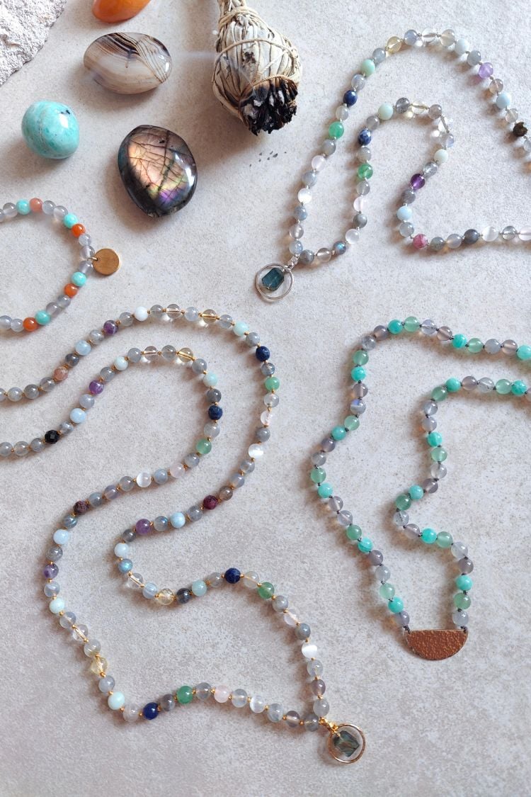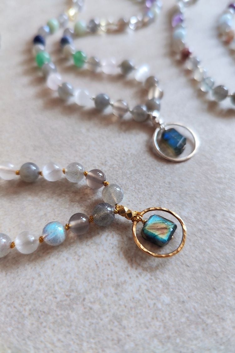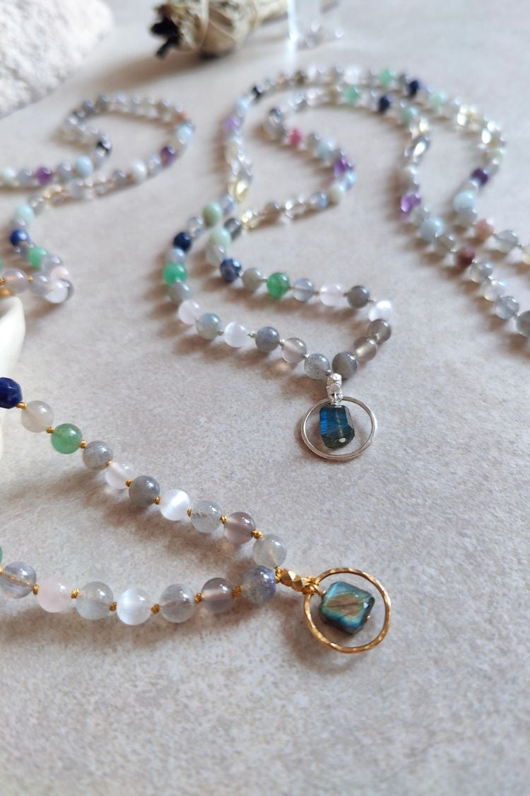 Herzstück der Mala ist der Labradorit – er verbindet dich mit der Magie der Rauhnächte und deiner eigenen Magie, die in dir liegt. Der Labradorit stärkt deine Intuition, inspiriert deine Kreativität, regt deine Phantasie an und hilft dir deine Träume mit der Realität zu verknüpfen. Mit ihm kannst du deine Wünsche für das kommende Jahr bewusst, voller Leichtigkeit und Vertrauen erkennen und entfalten. In ihm liegen all die Wunder und die Magie, die das kommende Jahr für dich bereit hält.