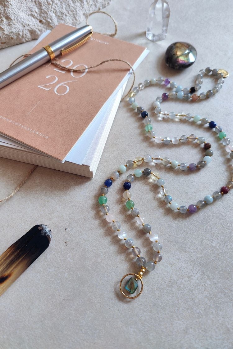 Zwischen den Labradorit-Perlen sind 12 kraftvolle Steine eingeflochten, die jeweils für eine Rauhnacht und die Qualität des entsprechenden Monats im neuen Jahr stehen:
