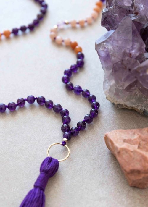 Diese Mala ist gearbeitet aus wunderschönen strahlenden Amethyst-, roséfarbenen Mondstein-, orangenen Aventurin- und sanften Rosenquarz-Perlen.