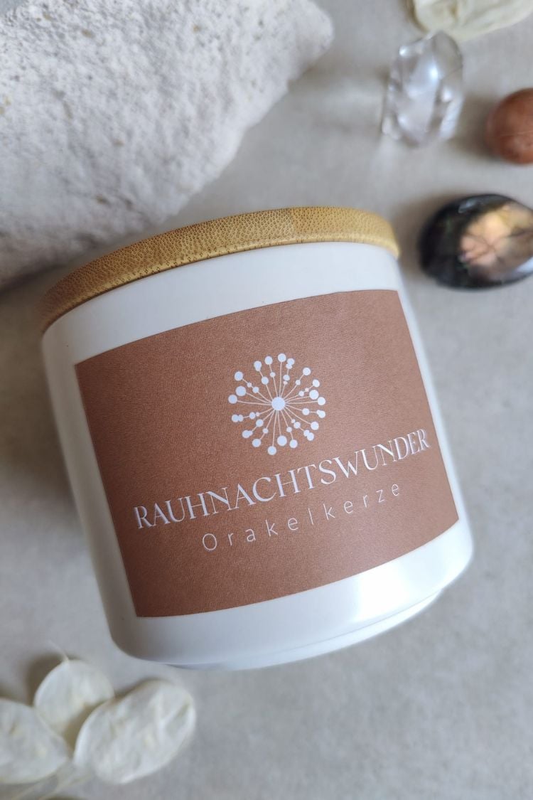 Tauche ein in die Magie der Rauhnächte mit unserer handgegossenen RAUHNACHTSWUNDER Orakelkerze, die liebevoll in unserem Studio aus hochwertigem Bio-Sojawachs gegossen wurde.