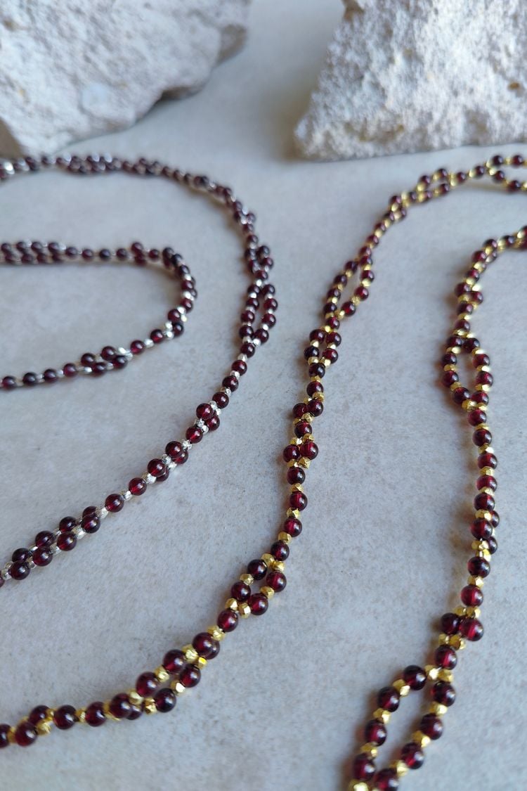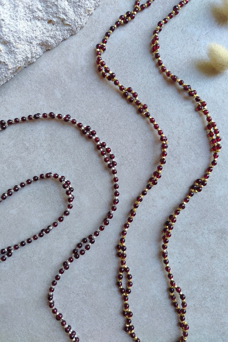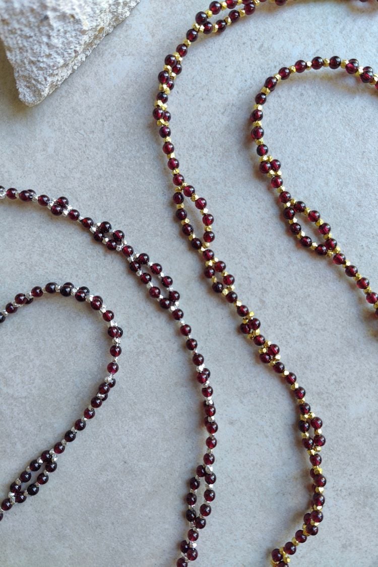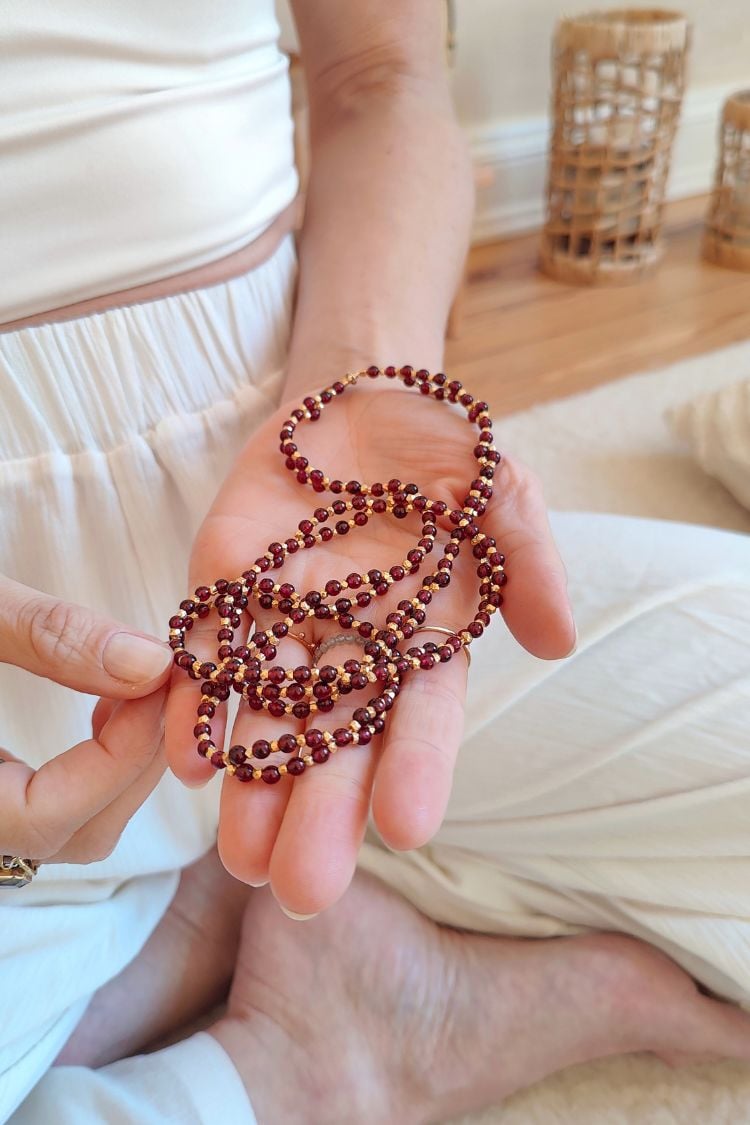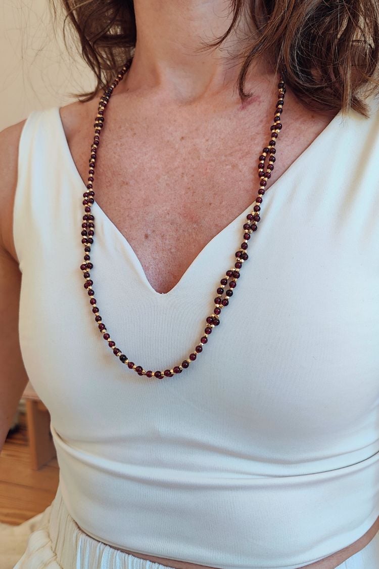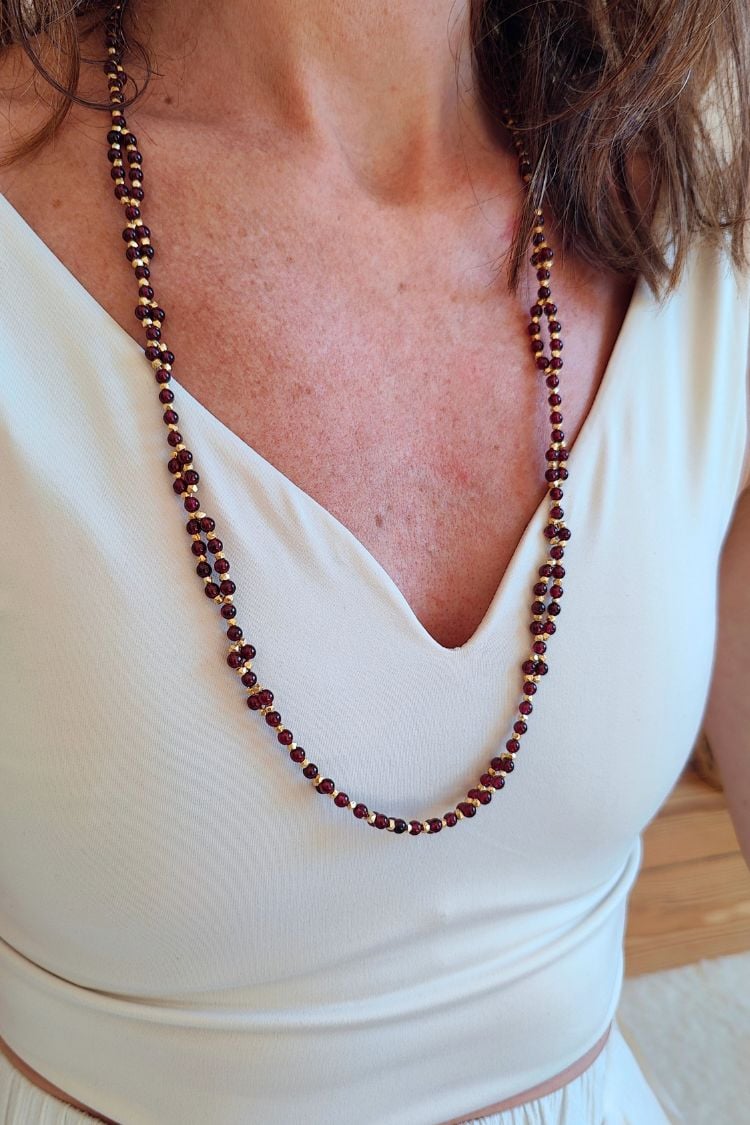 Die wunderschöne SACRED FLAME Tantric Necklace besteht aus 416, kunstvoll in einem heiligen geometrischen Muster angeordneten Edelsteinperlen aus intensivem Granat.