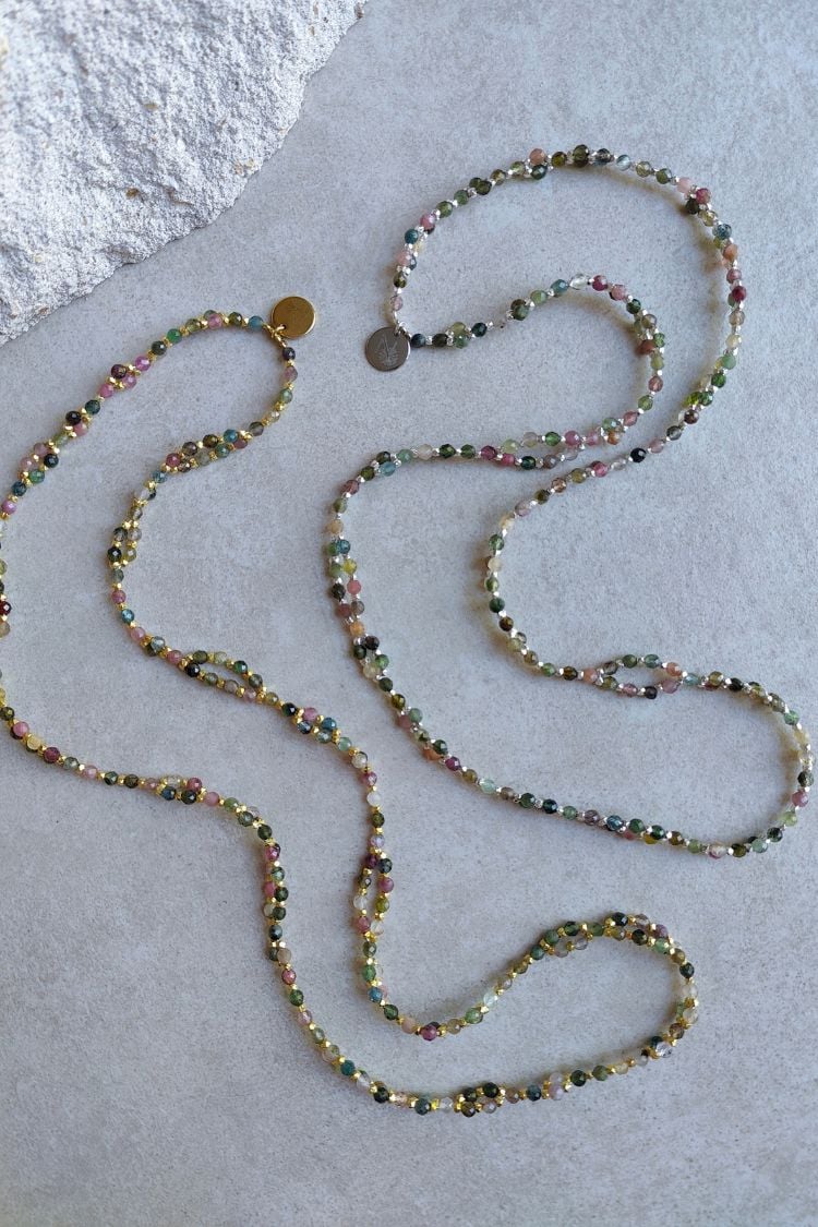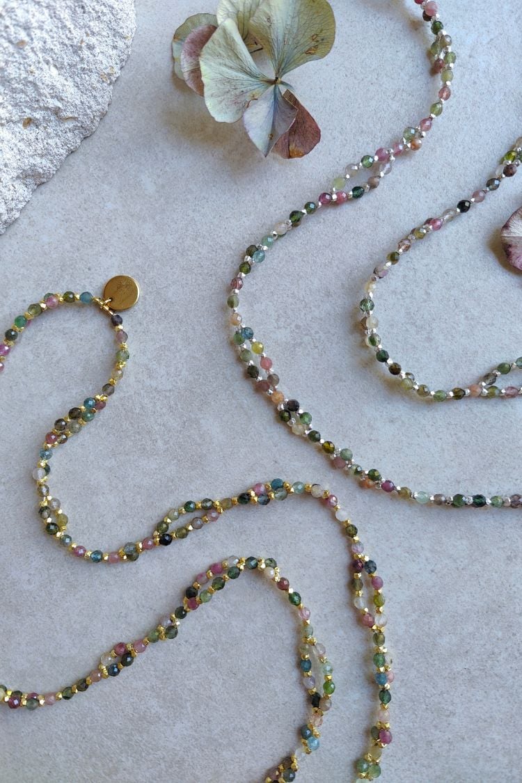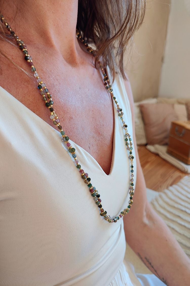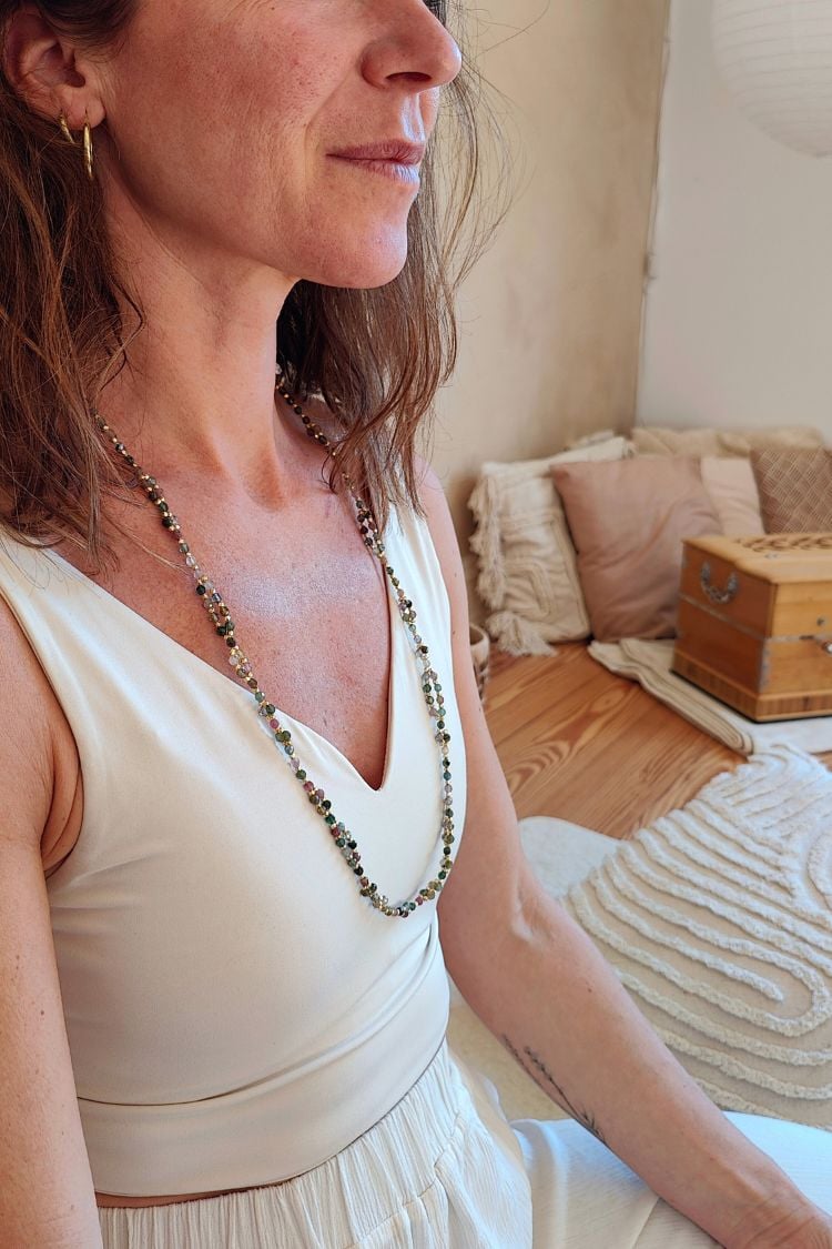 Entfalte den farbenfrohen Schmetterling in dir. Die SACRED METAMORPHOSIS Tantric Necklace aus buntem Turmalin begleitet dich auf deinem Weg deiner spirituellen Transformation und Entwicklung.