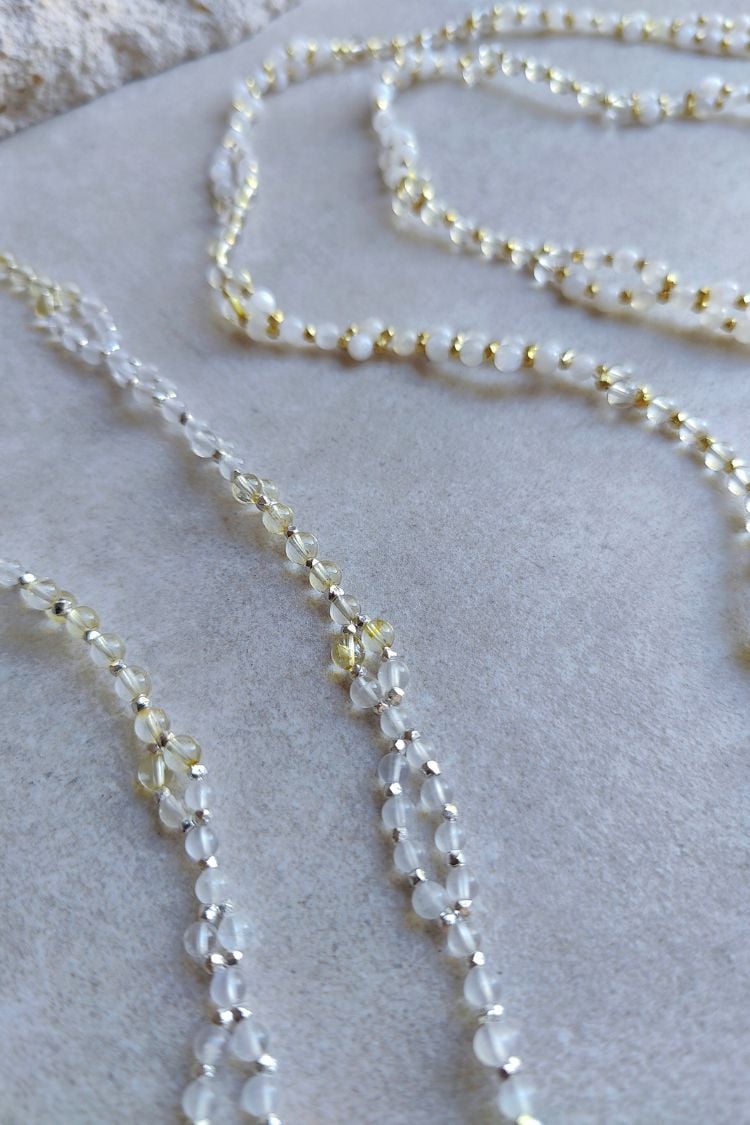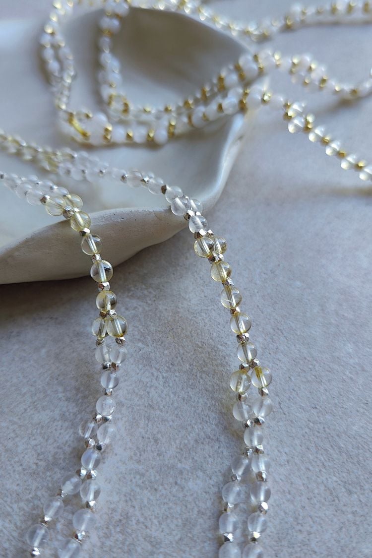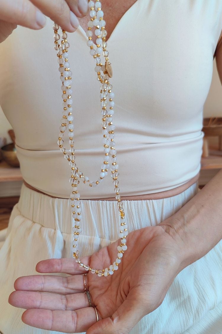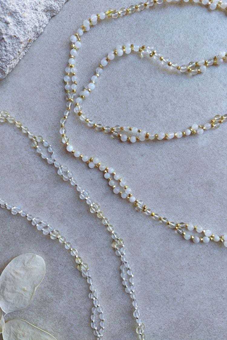 Die Verbindung von weißem Mondstein und leuchtendem Citrin der SOMA & SURYA Tantric Necklace lädt dich ein, deine Energien sanft in Einklang zu bringen und die Balance von Yin und Yang zu spüren.
