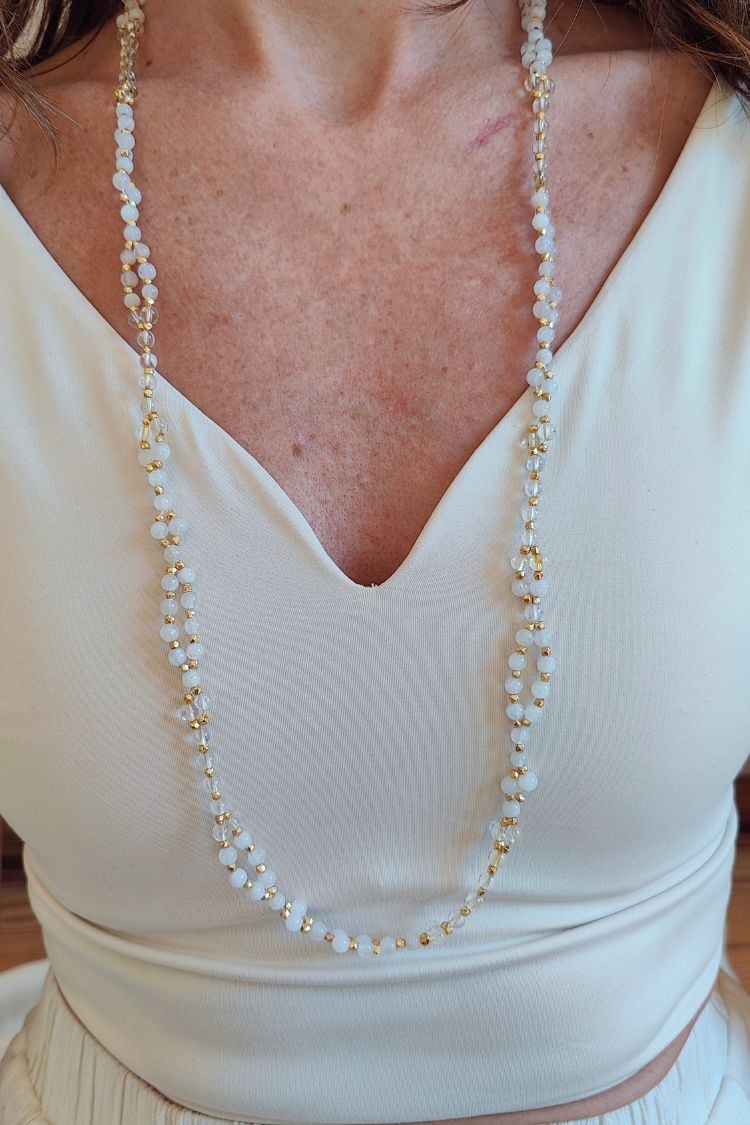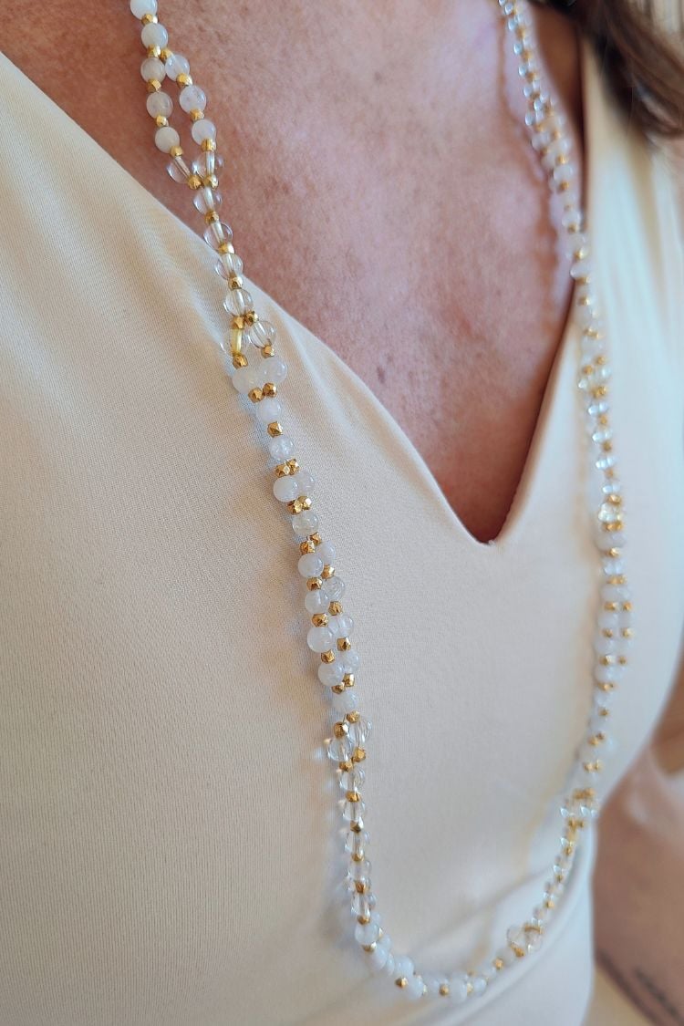 Die wunderschöne SOMA & SURYA Tantric Necklac  besteht aus 416, kunstvoll in einem heiligen geometrischen Muster angeordneten Edelsteinperlen aus weißem Mondstein und leuchtendem Citrin.