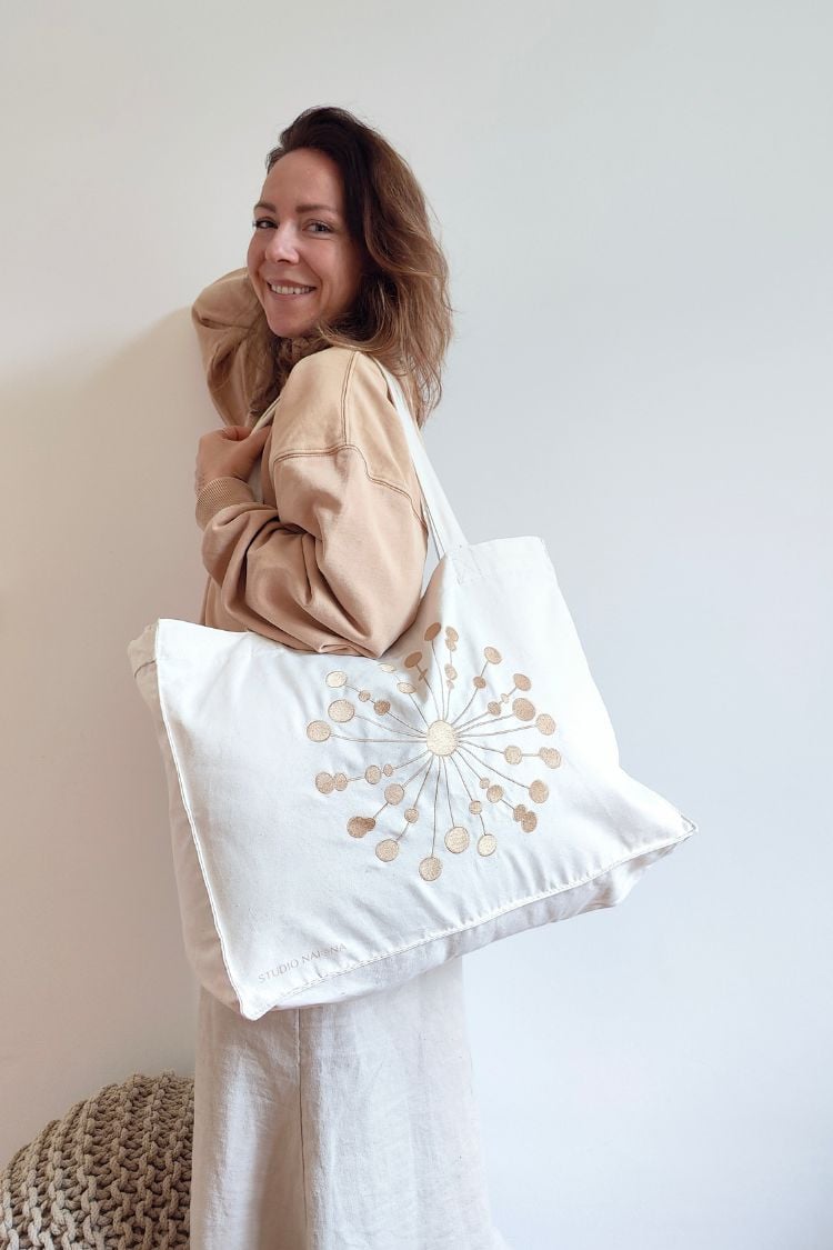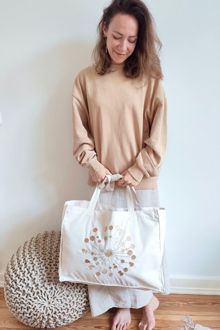 Mit viel Liebe und Achtsamkeit im STUDIO NAIONA kreiert, trägt die WEGBEGLEITER Tasche denselben Spirit wie all unsere Schätze: sie darf dich durch deinen Alltag begleiten – beim Einkaufen, auf den Spielplatz, zur Arbeit, auf Reisen, zum Yoga-Studio oder auf Ausflüge in die Natur oder in den Park.