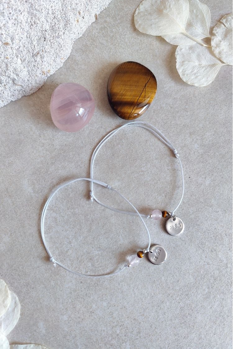 Dieses Bundle besteht aus zwei identischen feinen Armbändern, die aus aus feiner Nylonseide und einer 4 mm-Perle und einer 6 mm-Perle deiner Wahl gearbeitet sind. Auf Wunsch erhält jedes Armband noch ein geprägtes Plättchen.